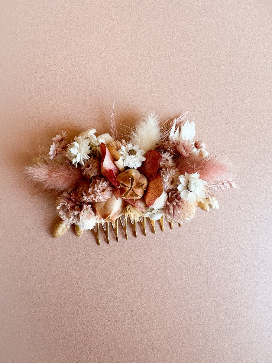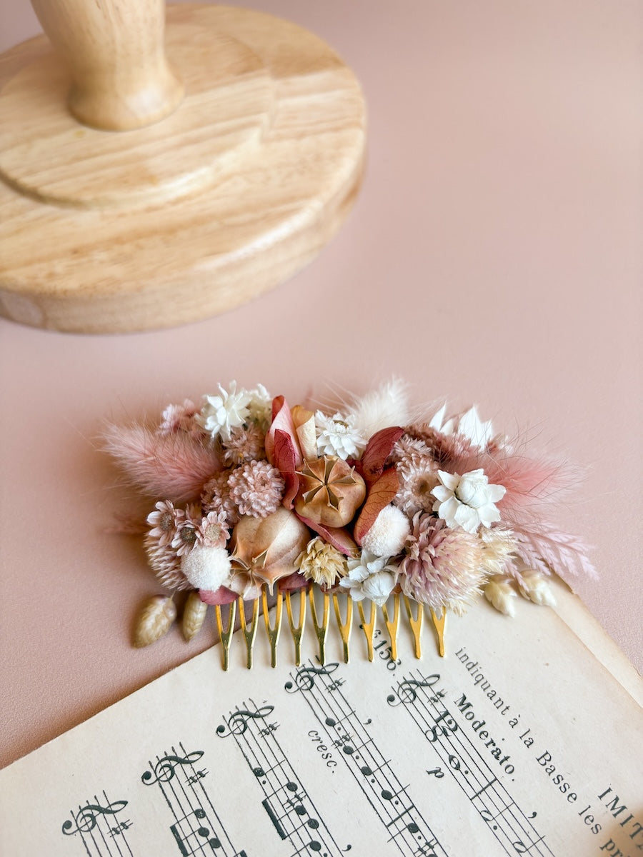 Sublimez votre coiffure avec le peigne Aphrodite orné avec grande minutie de fleurs séchées et stabilisées pour mariage ou autre occasion! Un accessoire poétique et élégant qui apportera une touche fleurie, idéal pour une mariée, une demoiselle d'honneur ou un témoin.